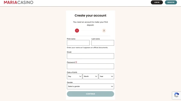 Vi holder kontooppsettet enkelt, slik at du kan gå fra registrering til spill med minst mulig friksjon. Du kan også starte på mobil og fortsette på desktop uten å endre fremgangsmåte. Hvis du allerede har en konto, er Maria login tilgjengelig øverst på siden, og spillhistorikk og grenser følger profilen din. Nedenfor er den vanlige registreringsflyten.